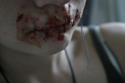 I have a lip piercing, so it didn't hurt at all! Just some wire and thread, and a needle and some fake blood
