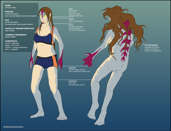 bio: anna lived on an island in north america with her mother and father. she loves to parkour and free run in the coves under her backyard. she grows fins on her arms and legs when she touches any kind of water and she grows gills so that she can breathe the water and webbing grows between her fingers and toes. she is a fast swimmer and she phases before most of the people she knows. she is often picked on and belittled because of her freakish looks.