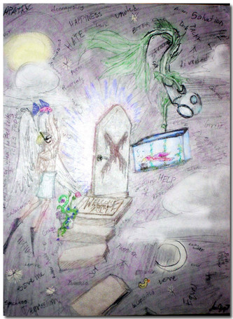 Part of a group of drawings with thin masked people.Hiding her past, hiding her secrets, hiding her everything.