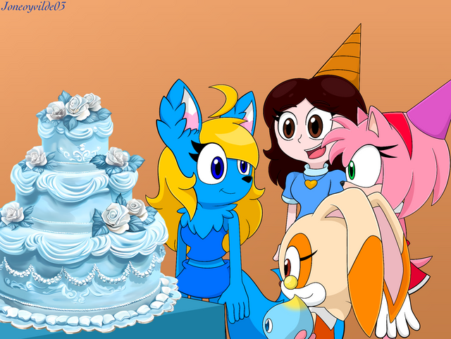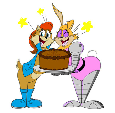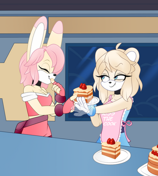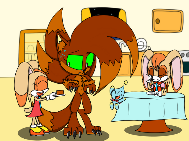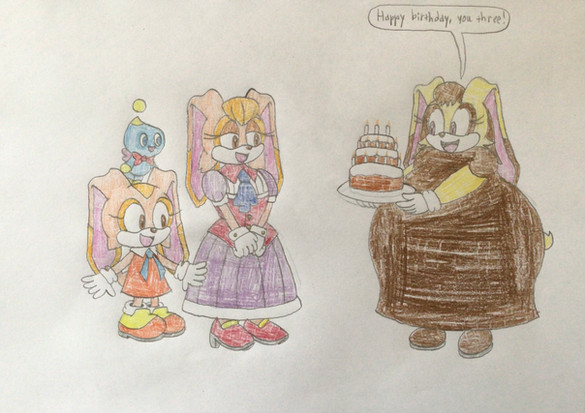A gift for system509 featuring his doggo Zack with Cream and Vanilla from my Sonic AU.Seems like Zack is both surprised by Cream's height and perturbed by her adding a carrot to a metropolitan cake, but she and Vanilla thinks its funny.