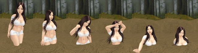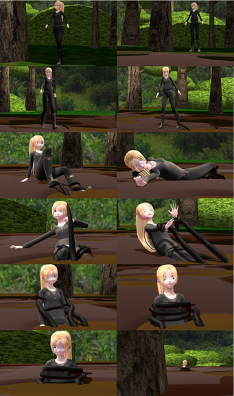The variety of facial expressions that you used for this really tells the story. In the first frame, she seems to be thinking how inconvenient and embarrassing this all is as she finds her strong, sexy legs hopelessly stuck in the tar. By the second frame, she's starting to worry as she slowly sinks deeper and looks around only to find no one around for miles. Love the next series of facial expressions as she settles further into the gluey trapped until the seventh and eigth frames where she finds her arms stuck, thus leaving her totally TRAPPED... the eigth frame is particularly good as she looks to be lifting and pulling at her stuck arms. By the last two frames she's calling for help, but little good it'll do her as she sinks into the dark depths below.