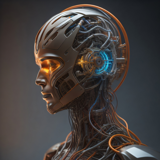 -------The image depicts a futuristic lab or workspace, where a humanoid robot with advanced Machine Intelligence capabilities is at the center of attention. The robot is sleek and sophisticated, with a metallic body that reflects the light in the room.