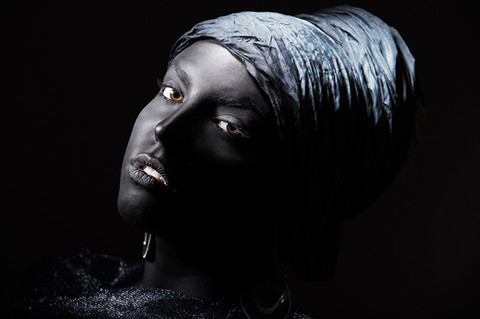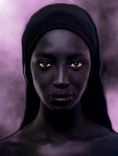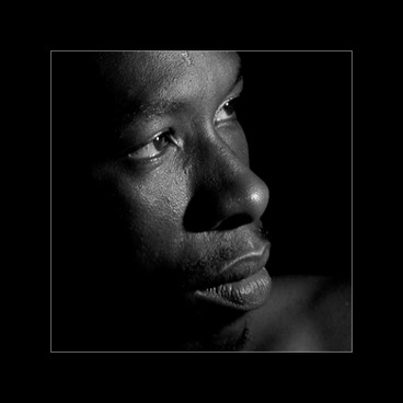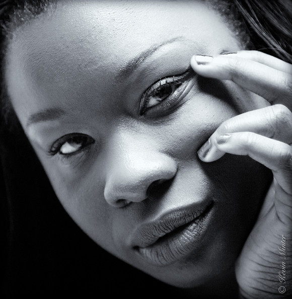 I really like this. I doubt the color version would have as much impact. Black skin, hair and background, a little swirl of sparkly shawl and those intense eyes that pull you in. This is a beautiful piece. I would like to call it something like 'soul of onyx' because it has a sort of mystical quality that makes me think of an iconic spirit within a dark gemstone. Well done.