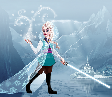 I love it, everything about it. The whole story of Frozen is derived from the Hans Christian Andersen story "The Snow Queen", in that story, the character that became Elsa is far from nice and sweet, like in the movie. This image captures all of that and adds a Star Wars twist to it. The colors are vibrant, despite being dark and "evil", the lines are clean and well defined. I would have loved a tad more detail on the lightsaber, to really tie it to the character, but now I'm just being picky. This doesn't look like a Disney Princess made for Star Wars, it looks like a character that should be part of the universe. My only criticism of it is the lack of an available print for purchase, I need this in my office. Very well done, keep up the excellent work.