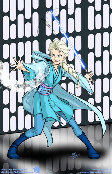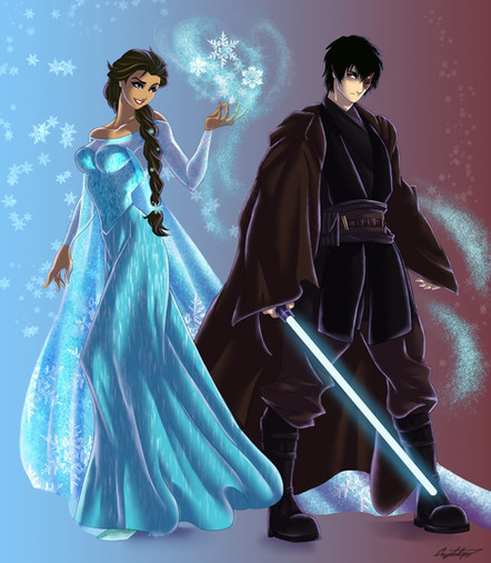 The piece is highly original and even more impactful than the jedi ariel was. The details and colors are perfect for the character of elsa while the sith deatures just scream star wars cross over. I can see this image being very popular with art fans, stsrwars fans and disney princess fans as well as cosplayers alike. I would not be surprised to see this at certain concentions and stsr wars fan events in the future like the jedi princesses. Amazing job overall especially with the sith snowflake she is holding, one of my favorite parts of the piece at hand.