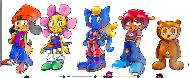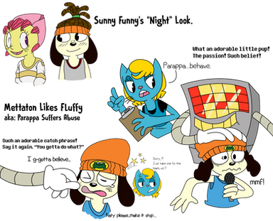 Once again my titles are simply amazing. But really, I've been into Undertale for the past couple of weeks and this strange and honestly grudging like I have for the game...put me in the mood to draw Parappa the Rapper. Go freaking figure. But this may tie into my insanity in wanting these two universes to cross over. It's very stupid and I make no attempt at having a logical or sane reason for my imagination taking such a weird turn.I gave Sunny a new outfit, since all she wears in the games is a literal triangle, my immediate instinct was to update her looks. So I ended up settling on a super cute outfit worn by Ranka Lee from Macross Frontier ('The False Songstress', she only wears it in that movie, I think). This kind of lead to me changing everyone's outfit just for the heck of it, take note PJ is actually wearing clothes. Also Parappa has a tail, not sure if I should keep it, but he is a dog so...I dunno.