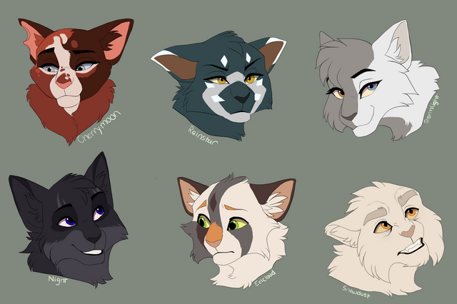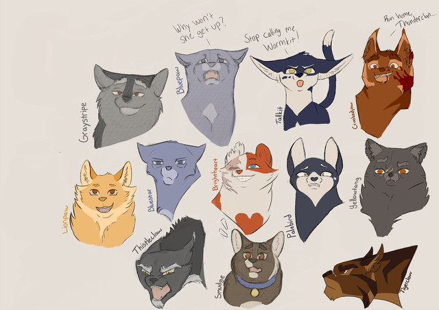 I was doodling around and did some designs for some characters of the first arcFeaturing Bluestar, Lionheart, Whitestorm, Cinderpelt, Spottedleaf and Tigerclaw