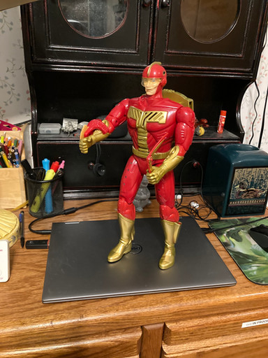 I present my rendition of a Retrofire-esque MiniZord or Karakuri Warrior Fuuraimaru from Power Rangers Ninja Storm (hey, I liked it) and Ninpuu Sentai Hurricaneger, respectively.MiniZord was made from a PVC figure with Gundam bits used for articulation. The short swords come from a 'Human Mode Deker' Megabloks figure and the katana from a dollar store ninja.