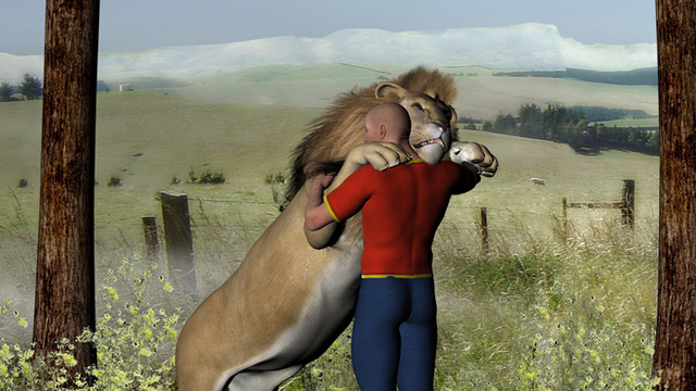 Do you want a hug?The lion may look full, but he wants more. At least this way he wont have to hunt for the next two weeks...