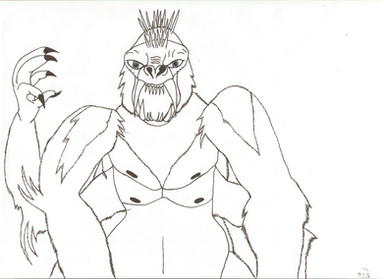 Speaking of fur, what a pain in the butt fur is to pen... well, for me at least. But the fur is a traditional gorilla color. However, the whale skin is albino in color, and his eyes are a blood red color. Sort of a reference to Moby Dick, but I also believe that the white would look cooler (and more unique) with the blackish color of the gorilla coat. Sadly, I lack the colored pencils that would make it look neat, so he isn’t colored.