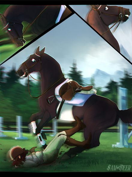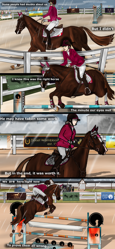 Oh man that third panel makes me nervous; what a great perspective! That ditch really does seem like a bottomless pit x.x but I love that his determination to do well for both himself and Jess gave him that bit of bravery do finish the course.