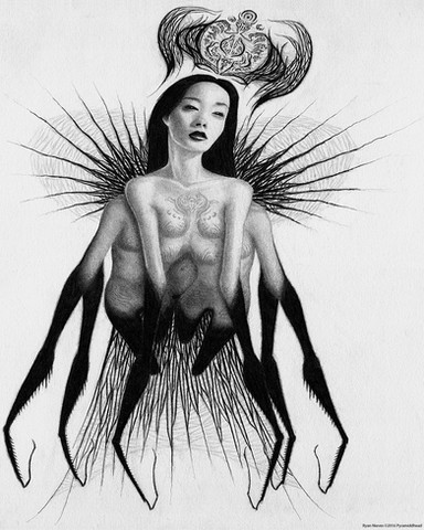 This demon depicted is from a city located in one of Abstractium's gigantic floating structures known as “Umbras'reihl” located beneath the clouds. As you descend from a wide winding bridge into darkness,looking below you can spot the city of Umbras'reihl. Descending into the city you can see the silhouettes of many different kinds of buildings, as the vast ceiling above seems to disappear and become coated in fog. Passing through the gates it feels like a massive ghost-town desolate and mysterious. It is always quiet with an odd stillness in the air and an always present ominous feeling. In this city a bone-chilling cold penetrates your very soul and the lack of sounds besides random chilling echoes creates an unsettling ambiance and atmosphere as you wander in darkness. Light is scarce here but it can be found in mysterious lantern-like vessels giving off a dim light. They are found in various places,shooting a sharp beam of light they act as a flashlight,sometimes revealing things you have never wanted to see..... Lurking in the city of Umbras'reihl are the kin of an ancient god, pale demons with various parts of them shrouded in pitch darkness. If any shrouded body part contacts mortal flesh, that flesh then becomes also shrouded in darkness. It is very unclear what happens to the contacted body part as it is not present anymore physically but yet still appears in a shadow form, this sensation inflicts a foreign yet painful sensation to the brain. It is rumored that if ones whole body becomes 'shadowed' they simply do not exist physically anymore and become a shadow. It is unknown if they still feel pain or where they have gone but it leaves them vulnerable to become absorbed. Entities here feed off these absorbed shadowed souls. Those who are unfortunate to become trapped in Umbras'reihl wander this dark city aimlessly disoriented and scared as the appearance of one of its many demons is unpredictable. Paranoia plagues the soul as they do no know what will manifest or when something is stalking them until its revealed in light or just simply to late then becoming a shadow....