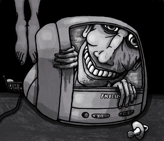 Abdul stands there frightened and confused about his current situation. Looking at the wall he notices a disturbing illustration showing several stick figures falling below a building into a fire containing three giant stick figures, the words carved into the wall read “AND THEY ALL FELL INTO THE FIRE”. Abdul panicked repeats several times to himself “This place is fuck!!!” as he back steps away from the illustration. Abdul begins to hears a familiar jingle, heavily distorted it echoes from the darkness ahead of him. The jingle is mixed with what sounds like a metal handle struggling to turn itself, scrapping the insides of some sort of contraption. Abdul sweating and shivering with anticipation for what maybe be coming. Fretting in place he stands no knowing what to do or where to go. It then appears from the darkness... Slightly suspended off the floor before him floats an abomination...something that shouldn't even exist in the most twisted of nightmares. The nightmarish entity shoots a black liquid onto Abdul before he even has the full time to realize and react to what he is now witnessing before him. It sprays onto the front of Abdul mostly covering the right side of his body. Feeling an intensely painful burning sensation he watches in horror crying as the liquid begins to corrode through his clothes onto his flesh. The jingle ceases, then theres is a moment of silence. Abdul looks up from his wounds as something springs out from within this abomination before him, grabbing him tightly and digging its sharp nails into his flesh. Its long tongue gently wraps around Abdul's neck, as he is petrified struggling to get himself to look all the way up. Looking into its face Abdul lets out a brief scream waving his arms struggling to escape, it bites his right hand clean off. Abdul looking at his right hand now missing in shock faints as it then pulls him with it into the giant box, the lid slamming shut. The handle begins cranking again and the jingle resumes as the abomination slips away into the darkness. Abdul's soul soon sinking into the depths of the Alternate Blackhaven Institution...