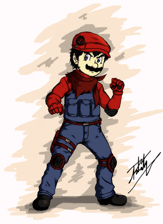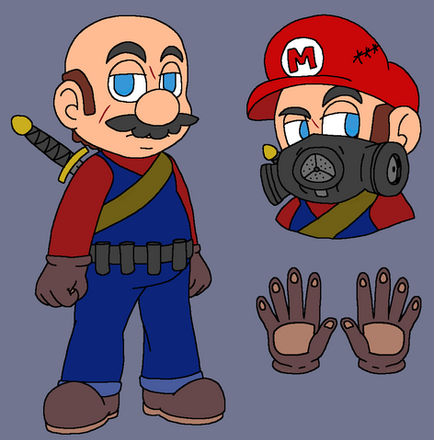 Mario Jumpman, a plumber stuck in a crazy psychotic world where the only source of civilization anymore is talking mushrooms and evil turtles, at least he’s got his trusty plunger and C.A.P.E (canister aero pulse ejection) pack!An apocalyptic Mario AU concept I came up with on the fly today, the acronym? Idk man it was last minute