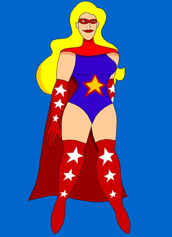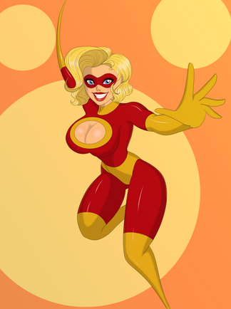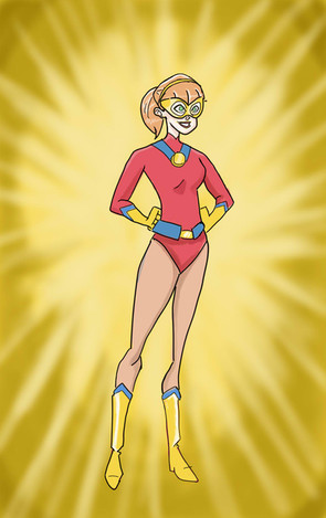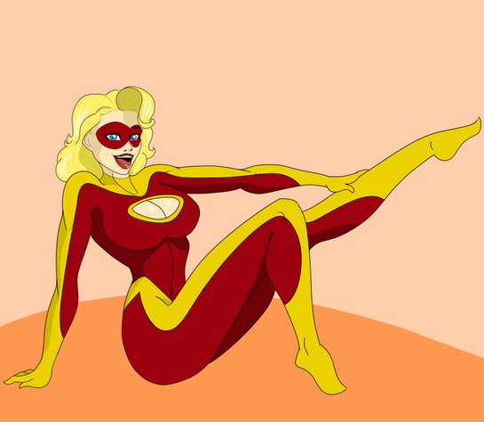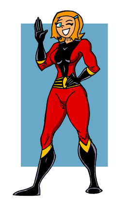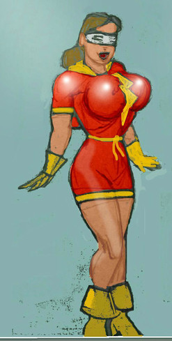 Omni walks up on the scene under flashing lights. She knows how to strut her stuff!This one's a full figure, using some of the same shading techniques as last time. I tried to get something close to the more "photorealist" style of comic book colors, like you might see in an Adam Hughes or Greg Land illustration. I like the way the light plays on the body, but it still seems like every part of the figure has the same texture quality, which makes it seem a bit too "smooth" overall. I'll probably need to investigate ways to vary the blending and maybe do some ink texturing, which might be a bit difficult on a bodysuit-style outfit.