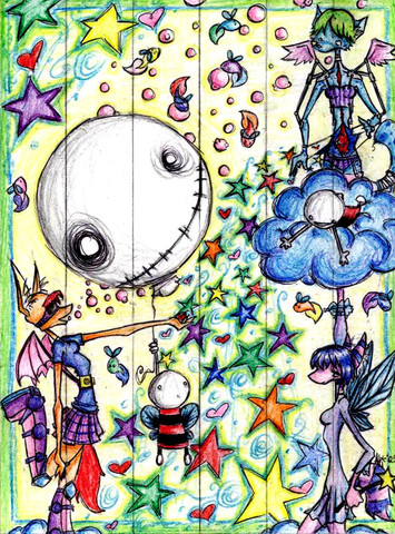 The sun makes me smile, as do the curling striped hills, and the checkered landscape. It looks really good, considering it was peiced together after scanning. I like how bright it is, and the delicateness of the fairy is really spiffy.