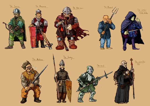 The warriors are the Death Knight who is an undead knight, the Barbarian/Berserker who likes to fight unarmored for maximum mobility and with dual weapons because they don't need shields or care about defense!, Rangers use bows to attack from afar but carry a dagger just in case, Knights are heavily armored warriors, Paladins are Knights with some healing powers, Warriors are the generic staple troops, Beastmasters are warriors who can summon animals to help them in battle, Bandits specialize in mugging people, Assassins are stealthy warriors who help whoever pays them the most, monks are religious warriors who fight unarmed using martial arts, and bards play music to keep their companions in high spirits.