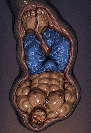 Darly stared in amaze as he watched the large human shape bugle that was Kyle slowly wiggling down the python’s long body until finally stopped at the centre. Darly couldn’t help but smile knowing Kyle has reached the python’s stomach, Darly watch as the bugle began slowly moving around, Darly couldn’t tell if Kyle was regeting his choose while being digested or if he was having his final pleasure being digested. It wasn’t long before the bugle made a quick jolt then finally laid still, Darly smiled knowing Kyle has know fully setted. Darly began walking out of the room leaving his python in peace to digest Kyle’s body, Darly knew it will take a few weeks for his python to completely digest Kyle, but wondered what would be left of kyle afterwards.