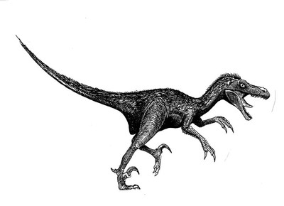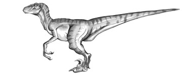 Whoa. I like the pose, but you really need to remember that this is not a human, and you've given it humanoid musculature on its arms and legs. When trying to draw theropod anatomy, use bird limbs as your main reference material. The skull is also misformed and he needs an earhole behind his head. Velociraptor was also feathered and had wing-like feathers over its arms.