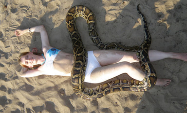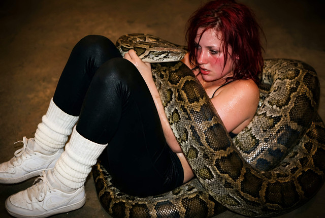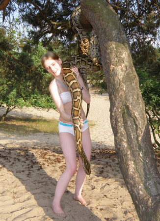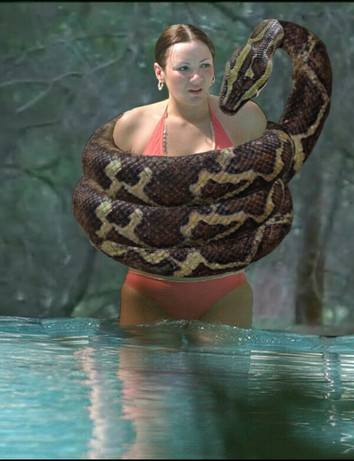 Wondering if the snake would actually loop a coil around her neck and start pulling her up.