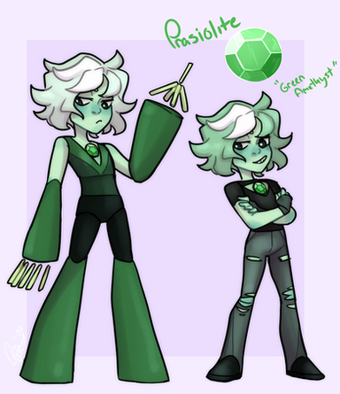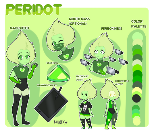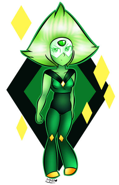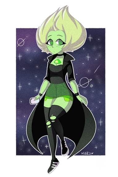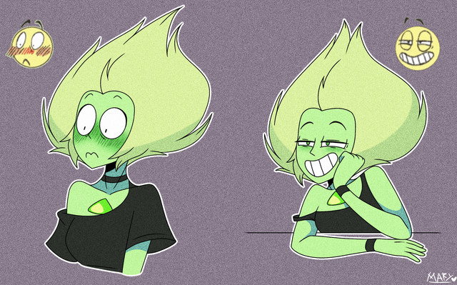 Peridot is a small friendly gem, who's super talkative and playful with her close friends and people who she's comfortable with, but she'll be quiet and timid around strangers and guys she likes