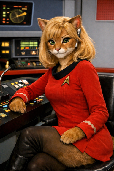 For people not familiar with Star Trek, the USS Enterprise actually had a canon furry crew member in the Animated Series that aired in the 70s. The Caitian Lt. M'Ress appeared in 6 of the 22 episodes. I'd been thinking of doing a manip of her ever since the new Trek animated series (which also has a Caitian crew member) debuted, and I found some good stock to do it with recently.