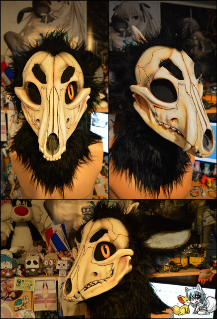 A lich fox with skeletal elements. This is the mask portion of the fullsuit. Hopefully I can get modeled shots from the owner.PLEASE NOTE: No, I did not get this idea from or copy your/your friend's/your mom's character. There's about 10,000 skull-faced characters out there. A lot of them have blind eyes. This is not that difficult a concept to just come up with out of nowhere.