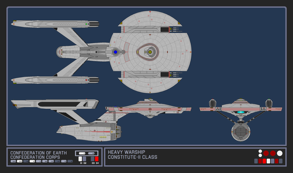 The Exodeus Class Heavy Battleships were the successors of the Excelsior Class Battleships, and as well improved most of it's parts in it's costruction, the biggest new part on the class was the saucer built specifically for this ship, the saucer would be used on other ships as time went forward.