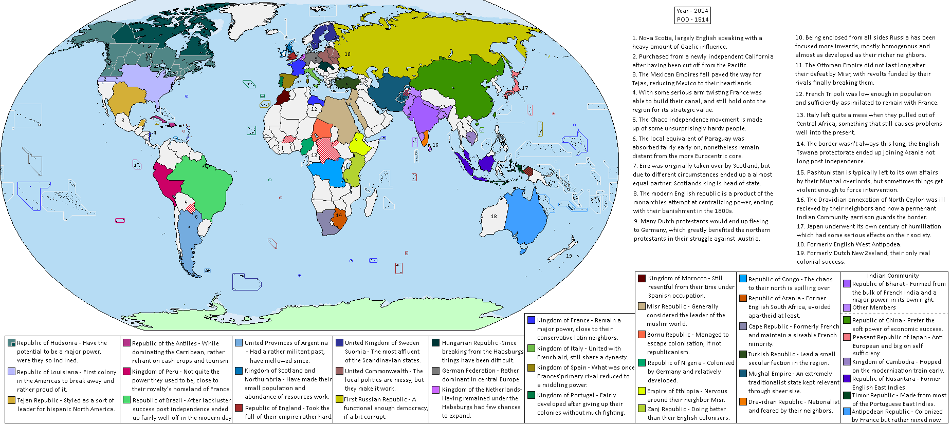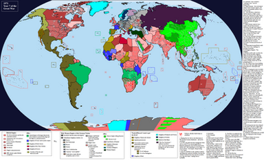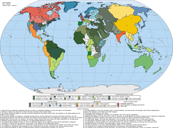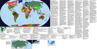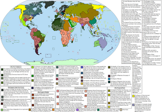 The Franco-Spanish and "English" blocks (it has become standard to talk about a sundered but still united by blood English nation, no matter how many continental immigrants have settled in North America) are currently engage in an ongoing cold war. The main "wild cards" outside this duality are currently neutral Austria and the Russian Republic, which has old grudges against both sides. France-Spain is a bureaucratic and rather technocratic absolutism, with the King-Emperor increasingly a figurehead for army, secret police and the Permanent Bureaucracy.The United Kingdom and the Kingdom of North America in the year 2003 (when this scenario appeared ) are respectively about as democratic as OTL German Empire and the UK in 1900, although the United Kingdom lacks the various insecurities suffered by Wilhelmite Germany. Russia is more democratic than either, but also anti-semitic (fortunately the Jews are allowed to flee abroad), xenophobic, and tub-thumpingly religious. (There was quite a religious revival after the fall of the Czar and the Orthodox Church essentially being privatized).