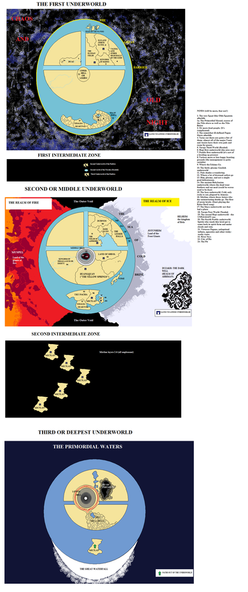 If going up is blocked by the Vault, going down is blocked by water. Using atomic weapons to create sufficiently powerful vibrations in the earth for sonar-type measurements, scientists have determined that the Encircling Mountains actually encircle a partially water-filled basin: earth underlies the inner seas, and extends downwards some five hundred miles, but below that there is water, with the earth apparently supported on a great number of vast pillars. The Outer Seas are connected with this Great Deep, and presumably of equal depth: how deep is unknown, since the most ingeniously reflected and counter-reflected wave vibrations can't resolve things more than a few thousand miles down. In any event, water pressures as one descends soon grow far too high for even the sturdiest of submersibles. There is some talk of developing a solid metallic probe with no internal voids, but the technology remains speculative.
