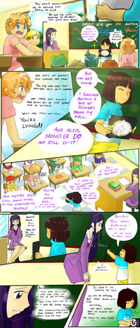 omg sorry for the late submission @_@;;And ENTER FRISK as they share with their classmates what they did during Summer Vacation! Some travel across the world, others stay at home, few may have gone swimming all Summer while Frisk discovers an entire underground full of Monsters!! Sadly, nobody believes their epic and thrilling story, since it has been a long long long LONG time since Humans came in contact with the Monsters that even magic had been lost from them. Guess asking help from the Surface dwellers won't be much productive, But that isn't going to let Frisk give up on the Underground! Just keep being positive and hopefully another plan shall turn up in the future! Until then, stay Determined.