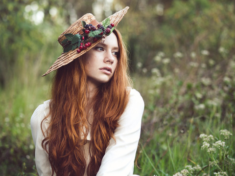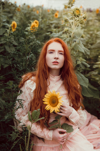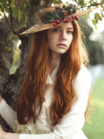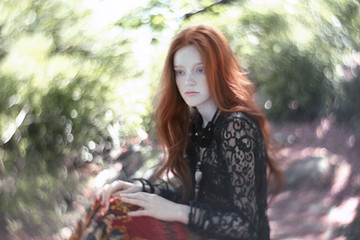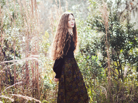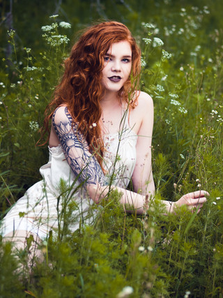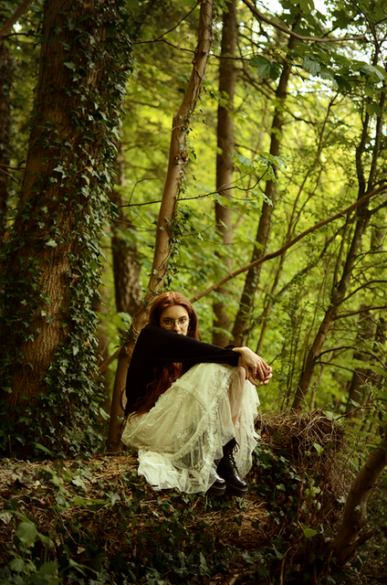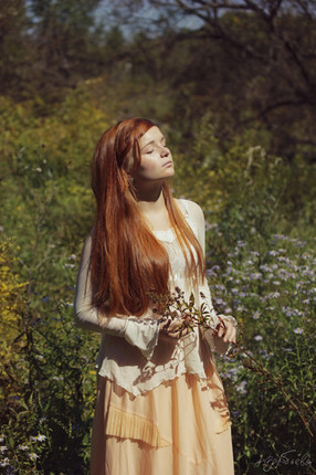 I had a big editorial shoot planned with Dakota and a whole team of creatives, so I decided that I ought to meet her and photograph her first! I fell in love with her thick, wavy hair and delicate face, and I was super excited to finally meet her and photograph her! She looks so much like a woman from a Waterhouse painting that I cannot wait to shoot with her again! She might just be beginning, but she's definitely a natural! I stuck with vintage dresses from my shoot closet for our test shoot to make it nice and simple. This is one that I got at an estate sale, it has a velvety painted skirt that's just wondrous! I believe, it's from the late 60s or early 70s, and it was actually made in Germany.Model: Dakota Zordan