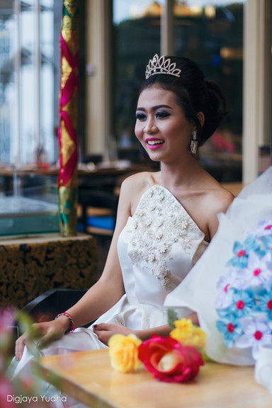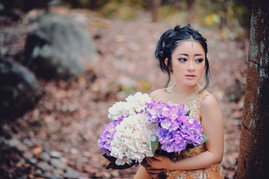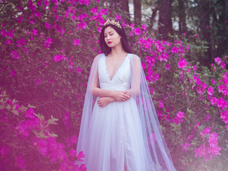 Love this one, for all the different parts of the composition, The violet haze is a little odd at first, but pulls the subject into the opulent beauty of the azaleas. Fits with the tiara and princess like quality of the wedding dress, and even the brilliant red of her lips. Beautiful work!