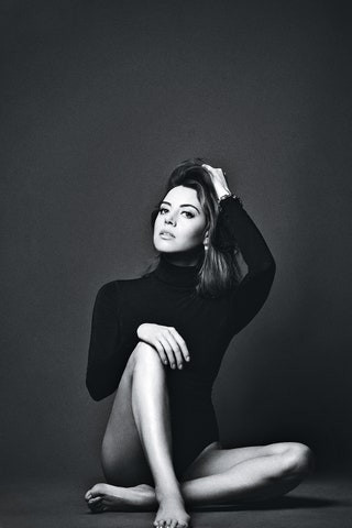 Her hair & makeup are all well done. A lovely pose by Hunter caught at the right time to show off her pretty face & sexy legs well