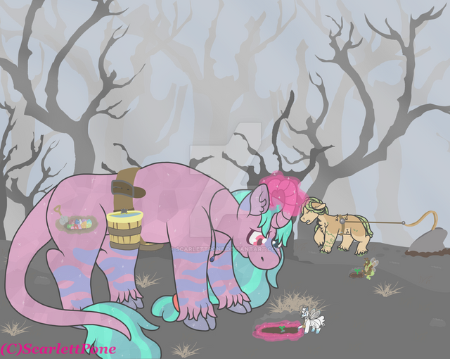 “Just about gave me a heart attack,” Scrapjack continued, smile falling into a pout. “Don’t know what we woulda done if we ‘adn’t—” she was cut off by another wave of violent coughs. Rotgut finally began to stir, shifting her weight so she could sit up and examine the smaller mare.