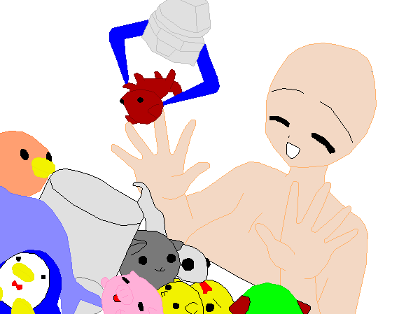 I have a puppet that looks like a red clown. She has two slots in her arms from and I often put a fake knife in one of the slots and chase my siblings.