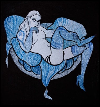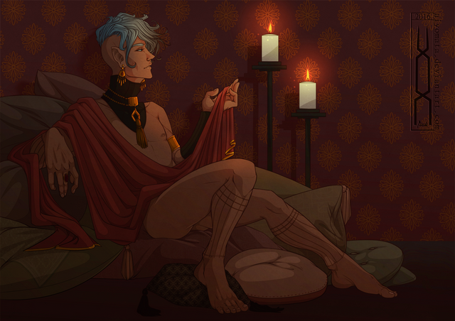 I've been wanting to do an odalisque for a while, since I haven't had much of an opportunity since back in Ye Olde Art School. Zevran seems a suitable subject for such, no?