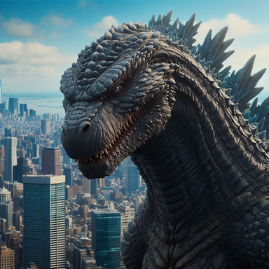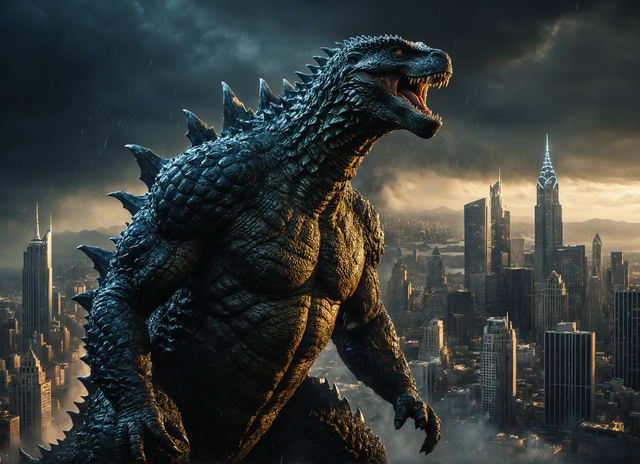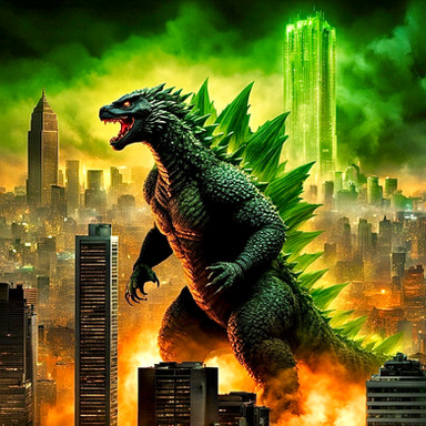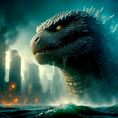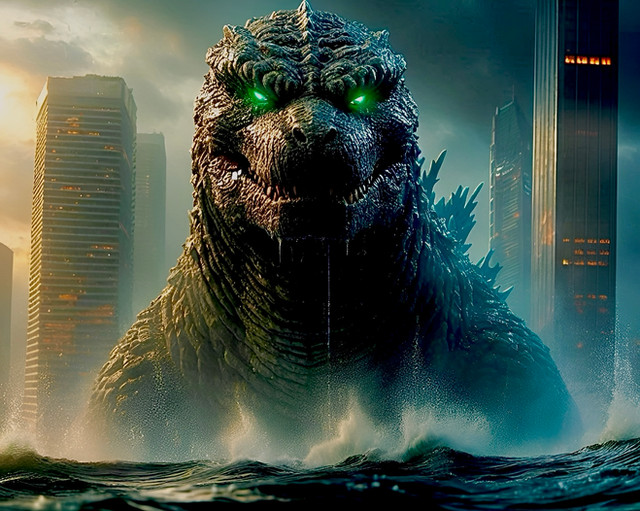 An epic cinematic shot of Godzilla, the legendary kaiju, emerging from the depths of the ocean. His massive, scaly body is covered in water droplets, and his gleaming green eyes are filled with determination. Towering skyscrapers lie in ruin in the background, with smoke billowing from the destruction. The overall ambiance of the scene is intense and powerful, reflecting the raw strength of the king of monsters.