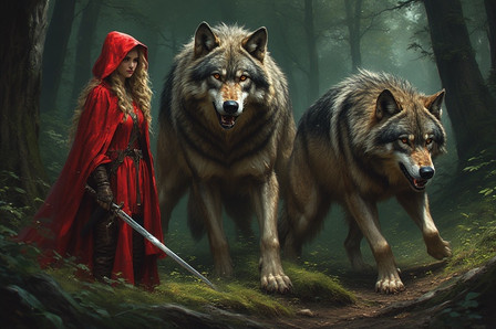 Little Red Riding Hood and her fearless white wolf and loyal companionsΒCreated by KellyLynnMartin using AIPHOTOLEAP π€ πΆ