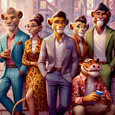 From the movie Zootopia, showcasing the city's vibrant and diverse population of animals. The foreground features a bustling street with a mix of predator and prey living together in harmony. In the background, the city's skyline is filled with towering buildings and a majestic waterfall. The overall atmosphere of the image is lively and full of energy, with a sense of hope and unity.