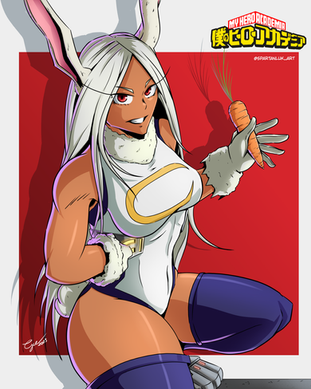 #carrot #character #cute #illustration #miruko #munching #muscle #quirk #strong #thigh #thick #heroine #rabbitgirl #darkskinnedgirl #bokunoheroacademia #myheroacademia