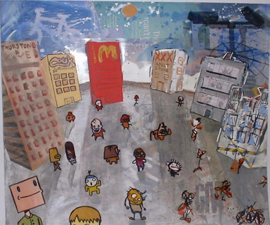 ta hermoso, el otro dia no tuve tiempo de dejar comment, asi q lo favie, pero lo encontré la raja ^^ muchos seres se creen superiores por su poder adquisitivo, y el mall es el lugar al que van a ganarse el respeto y el prestigio, entran por primera vez con nada y salen siendo parte de la sociedad de la que tal vez inconcientemente desean ser parte... tal vez no sea tan así en la realidad, pero es una forma de analizar un hecho para mí y es lo que me provoca tu pintura