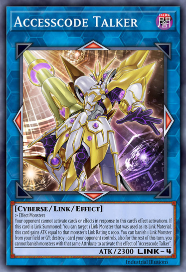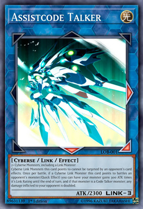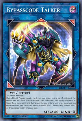 This monster and monsters co-linked with this card cannot be destroyed by battle and gain 500 ATK. Once per turn, you can target 1 Cyberse monster you control; it can attack your opponent directly. If this card or a monster it points to attacks your opponent directly; you can make the damage 0, and if you do, halve your opponent's LP. You can only use this effect of "Bypasscode Talker" once per turn.