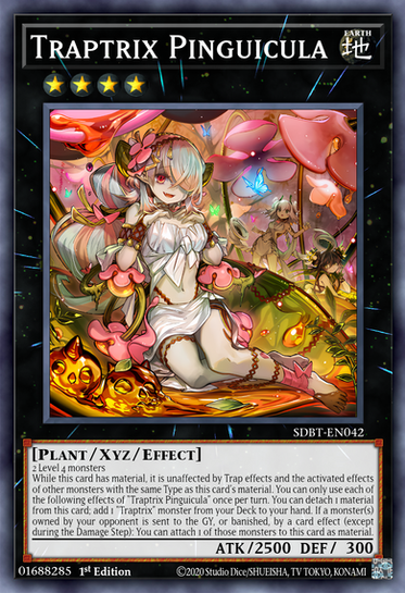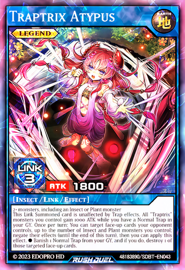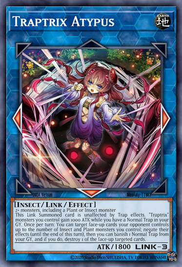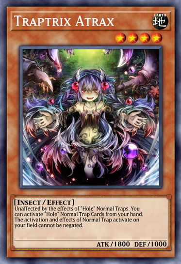 Unaffected by Trap Cards. If you activate a "Hole" Normal Trap Card: you can target 1 "Traptrix" monster or 1 "Hole" Normal Trap Card in your GY with a different name and add it to your hand. If you Normal/Special Summon a "Traptrix" monster to a zone that this card points to: You can target 1 "Hole" Normal Trap Card in your GY and set it but shuffle it into the deck when it leaves the field. You can only use each effect of "Traptrix Angusti" once per turn.
