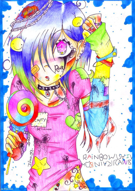 I bought a whole set of new watercolors and brushes and papers and a sketchbook and inks and a fountain pen with my own money for the first time...from an art supply store...it was heavenly *___*SOOO here is my first time using them! I wanted to use as many colors as possible. BRIGHT colors. So I was OH, I'll just do a decora fashion pinup or somethin'. Well, it's not really a pinup...she's not like...sexy...just...rainbow...
