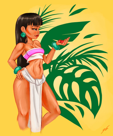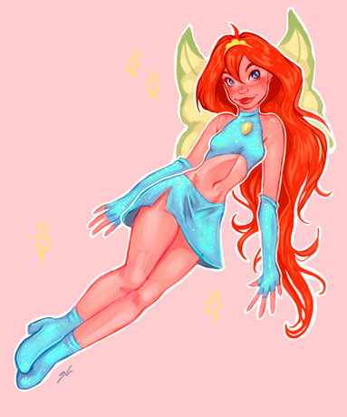 Oh wow that's beautiful. I wouldn't have ever guessed that she wasn't already wearing the stockings. I love how the dress is exploding, for lack of a better word, into the splatter affect. I also really love the color you made her hair. Beautiful work.