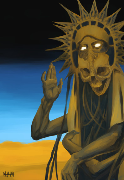 I had the idea of him straying through the desert and a sandstorm following him all the way. Thank you!