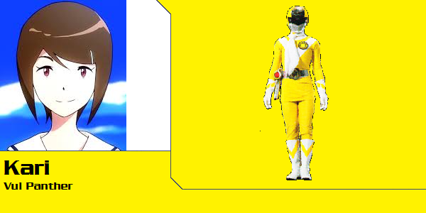 Cathy from Yu-Gi-Oh! ZeXal is chosen to be the Yellow Thunder Ranger.Since she has a love for cats, yellow was the best choice because her zord is the saber-toothed tiger which happens to be a cat.