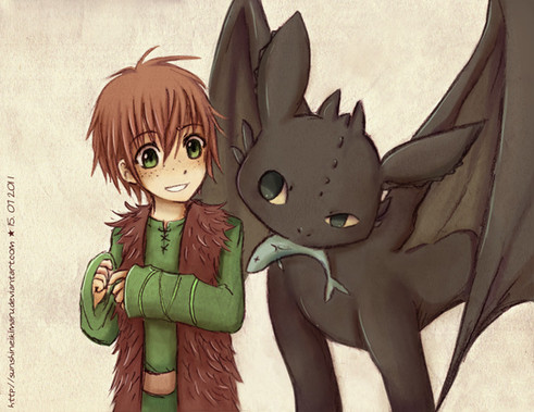 I like how hiccup is holding the fish out like he doesn't want to hold it any more, while in the movie he clutches it to his chest like ' I am going to die! i know it!'. but I still think Toothless is hotter than hell itself!!! *faints again*