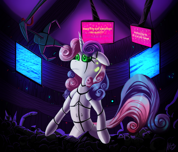 i haven't done much Sweetie Bell art...if any really...and i really haven't done any Sweetie Bot art. so being inspired to show my take on the song, i decided to take on the challenge of drawing something...different.